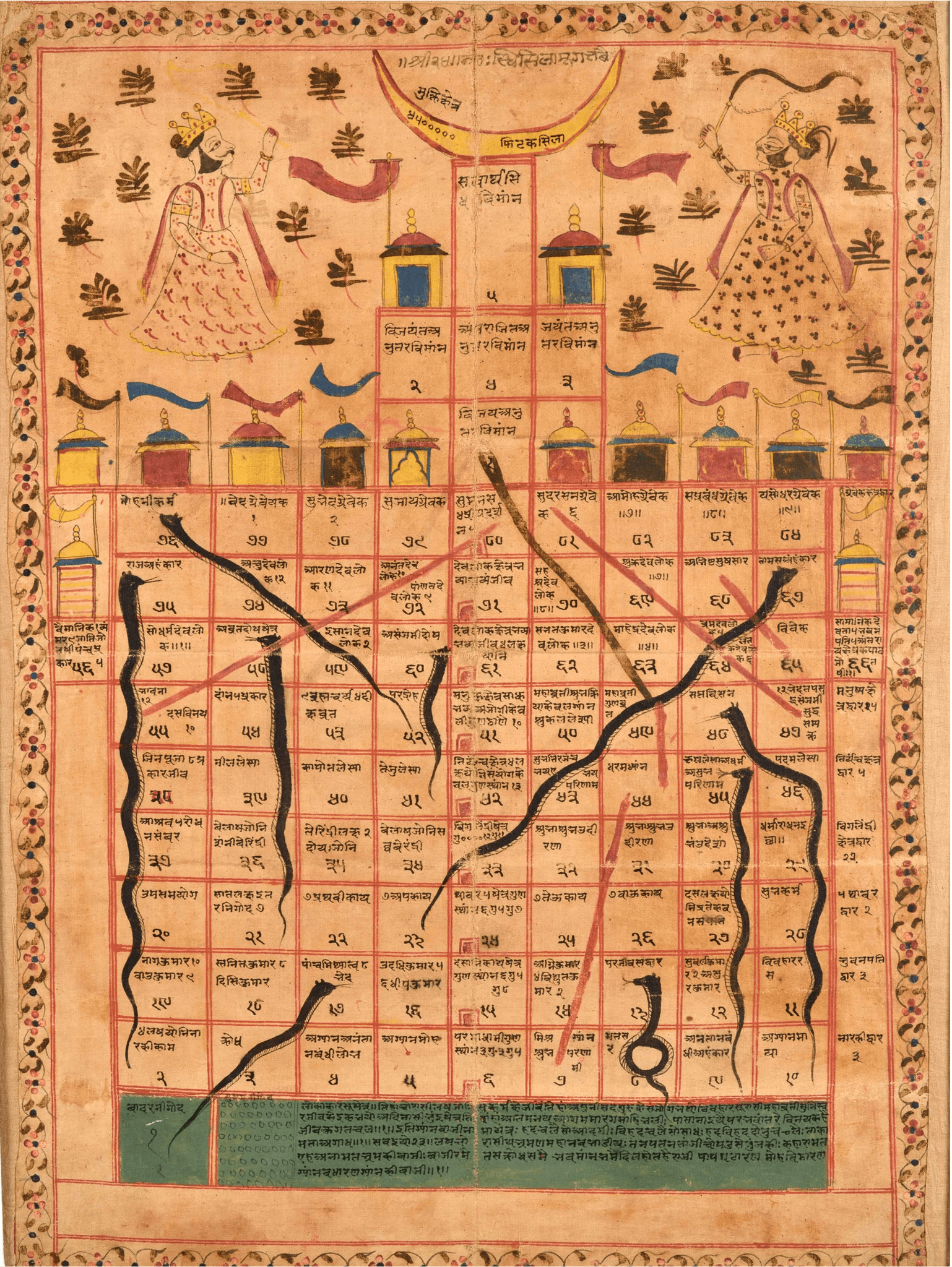 Born in ancient India, Gyan Chaupar was more than a game, it was a spiritual map of the soul’s journey toward liberation. Rooted in Hindu and Jain philosophy, its ladders symbolized virtues leading to moksha, while snakes represented vices that pulled one back into the cycle of rebirth. As it travelled across cultures and centuries, Gyan Chaupar evolved into the modern Snakes & Ladders. Its deeper lessons of morality and self-realization gradually lost to time, replaced by the simplicity of chance and play.